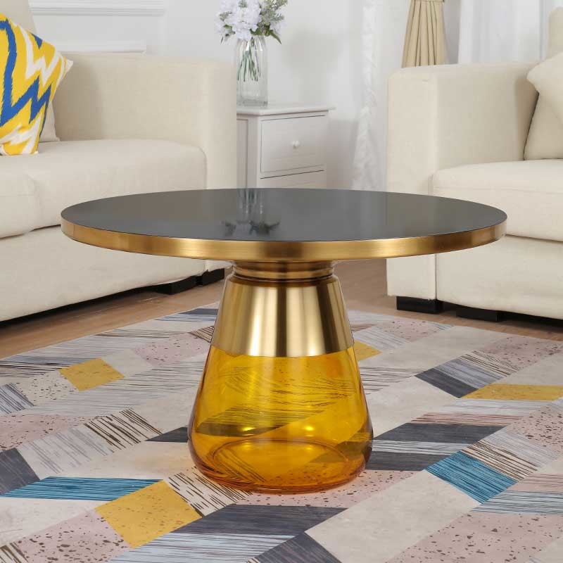 The advantages of shape and color make this coffee table have more characteristices that distinguish it from other coffee tables,such as agile appearance and brilliant colors,the black tempered panel is matched with a golden stainless steel support frame,and it is combined with a colored hand-blown glass base,all the time without emphasizing the function of products and materials