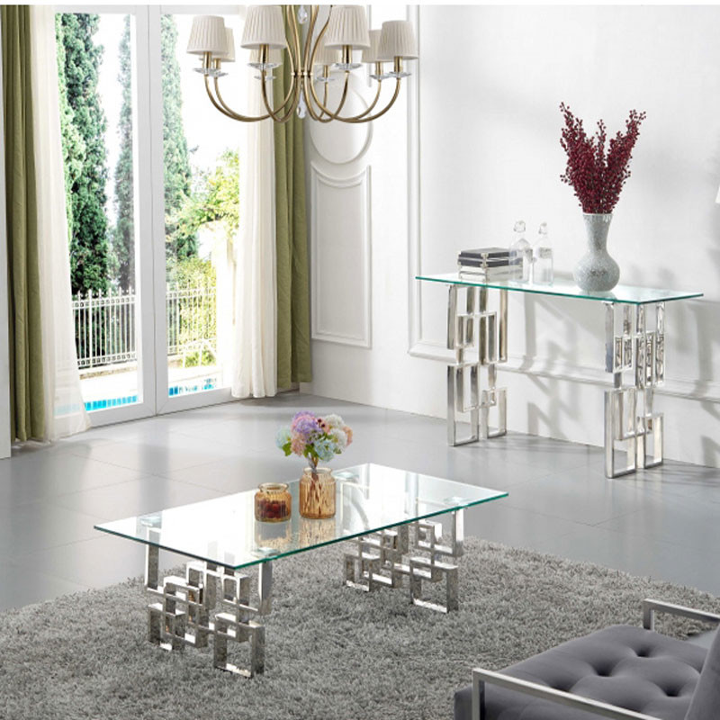 Anchor your living room layout in statement-making style with this clean-lined coffee table. Marrying modern and glamorous elements, this piece is founded atop two stainless steel legs with geometric openwork and a solid metallic finish for a sleek touch. Up above, the rectangular top is crafted from clear glass, providing an easy-to-clean surface to set down snacks,drinks, magazines, and more.
